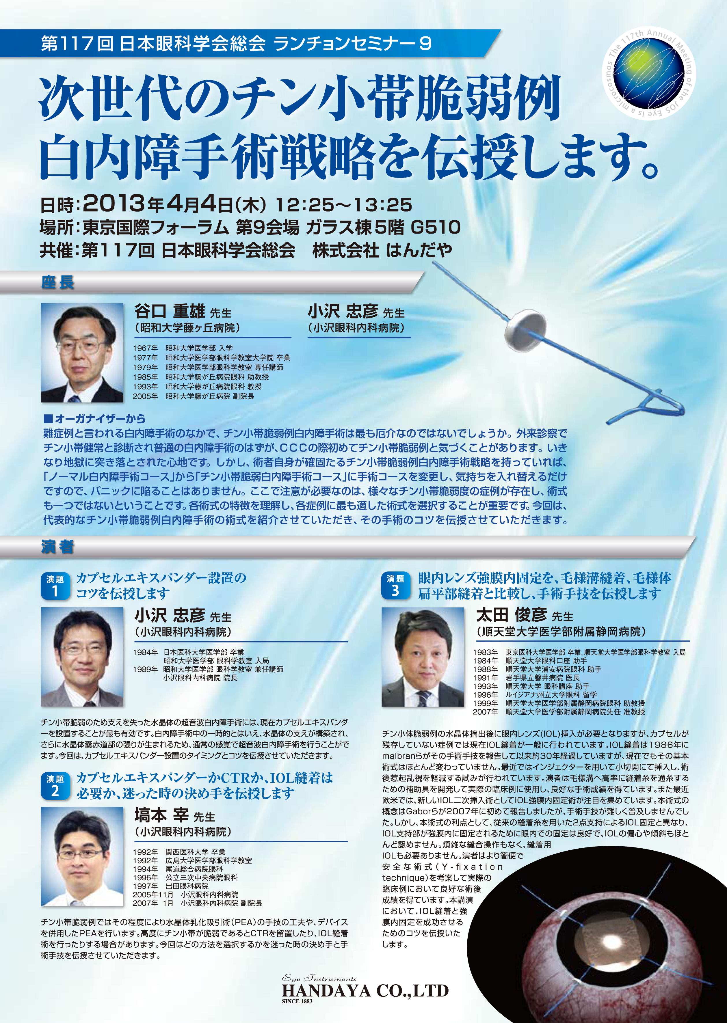 | ◆下記、学会に展示をいたします。ブースにてお待ち申し上げます。 第42回日本白内障学会 第18回日本眼内レンズ屈折手術学会 (国立京都国際会議場 2003年6月27日〜29日) 第59回日本弱視斜視学会総会 第28回日本小児眼科学会 (神戸ポートピアホテル 2003年6月27日〜28日) ◆製品情報 ・IOL&RSにて掲載の「雑賀式セントラルデバイダー“かちわりちゃん”」のカタログは ⇒ここをクリック ・第42回日本白内障学会 第18回日本眼内レンズ屈折手術学会にて発表されました、 HS-9836 大内ョッパーは・・・ 画像⇒ 写真1 写真2 映像⇒ VTR1 VTR2 |